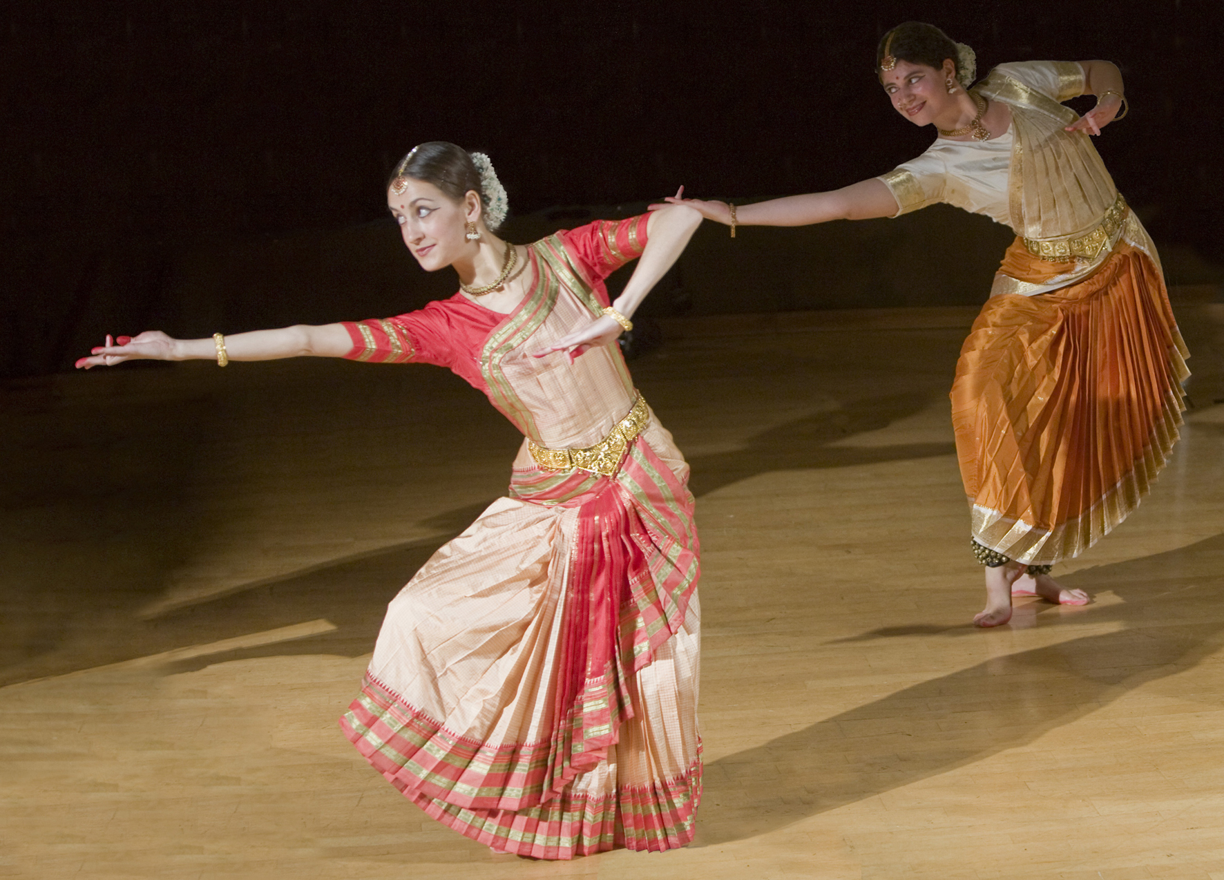Bharatanatyam, dance of South India, creations Beeja Company, London. With Arianna Balalabio and Helena Paskevica, formed in London by the Indian master Anusha Subramanayam. Bharatanatyam is characterized by the alternation of abstract patterns (the expression of the hands and face) and narrative forms borrowed from mythology.
